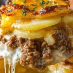 I remember the first time I baked this Cheesy Hamburger Potato Casserole — the house filled with that warm, savory smell of browned beef and melting cheddar, and everyone raced to the table. It’s a cozy, one-dish meal that combines thinly sliced russet potatoes, seasoned ground beef, and a creamy mushroom sauce, finished with a blanket of bubbly cheese. It’s perfect for a busy weeknight or a relaxed weekend family dinner, and if you love casserole comfort food, this sits right up there with a classic cheesy ground beef and rice casserole in crowd-pleasing power.