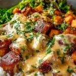 This bowl is the kind of recipe you turn to when you want something fast, nutritious, and satisfying. It pairs sweet, caramelized potato edges with well-seasoned chicken and a tangy, creamy sauce — the flavor contrasts keep every bite interesting. It’s also flexible: swap grains, double the veg, or make it spicier for hungry teens.