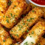 Delightful and gooey crispy mozzarella sticks, perfect for snacks, appetizers, or party food.