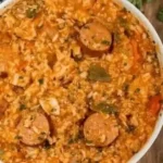 A hearty, one-pot meal combining tender chicken, smoky sausage, and colorful vegetables, slow-cooked to perfection.