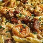 A hearty and creamy pasta dish featuring penne, shrimp, chicken, and andouille sausage, spiced up with Cajun flavors.