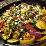 This Easy Mediterranean Chicken Stir Fry Recipe is a quick one-pan dinner packed with juicy chicken, zucchini, bell peppers, and red onion in a bright lemon-garlic finish.