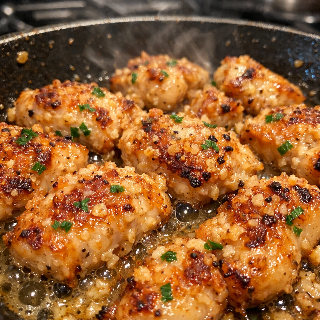 Keywords: Garlic Parmesan Chicken Bites, garlic butter chicken, easy chicken appetizer, skillet chicken recipe