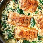 This recipe goes fast, so here’s the plan: season and sear the salmon until golden. Remove it and sauté the onion and garlic. Toast the orzo briefly, then add broth and simmer until almost tender. Stir in spinach, lemon, and Parmesan. Nest the salmon back on top and finish for a few minutes so the flavors marry. Serve with cracked pepper and a sprinkle of chili flakes.